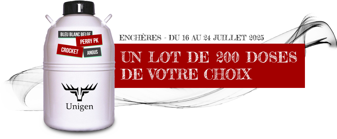 L'enchère se déroule du 16 au 24 juillet 2025 et tous les taureaux ici-bas sont disponibles. Il est à noter que des frais de livraisons pourrait s'appliquer si le biostat doit être expédié à l'extérieur du Québec. Cette offre est valide au Canada uniquement. Un minimum de 10 doses par taureau est requise. Jusqu'à épuisement des stocks. Le prix affiché n'inclue pas les taxes. Les taxes de vente s'appliquent selon la province.