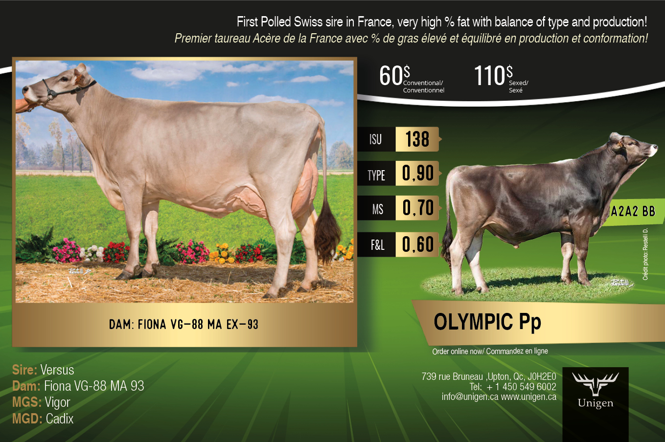 First Polled Swiss sire in France, very high % fat with balance of type and production!