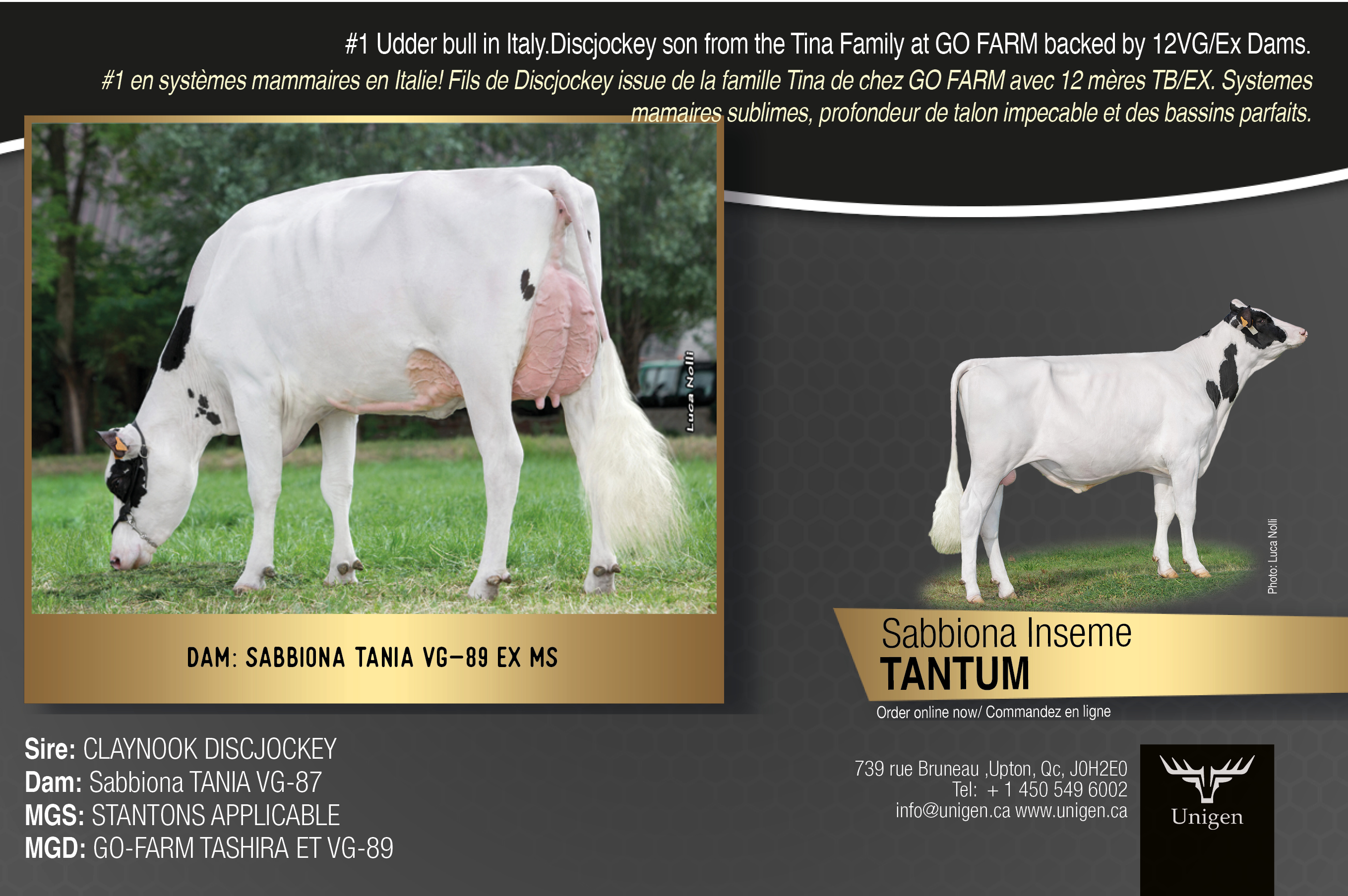 #1 en systèmes mammaires en Italie! Fils de Discjockey issue de la famille Tina de chez GO FARM avec 12 mères TB/EX. Systemes mamaires sublimes, profondeur de talon impecable et des bassins parfaites.
